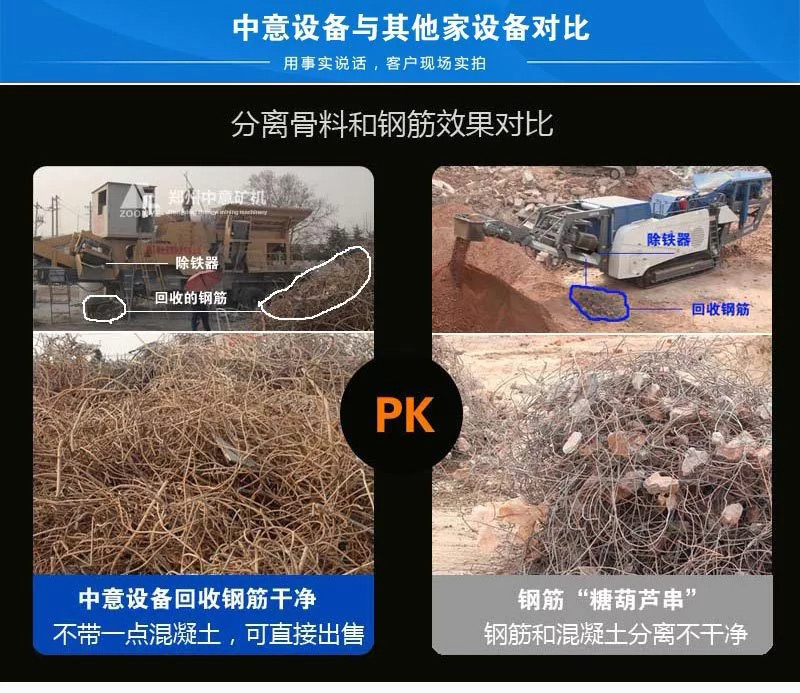 在破碎建筑垃圾时,移动破碎设备和移动筛分设备的配合,可快速将建筑垃圾钢筋块进行破碎、除铁、筛分等工序,短短数分钟内,大块混凝土转化为多种不同尺寸的砂石骨料,比如沙子、石子等,可用于搅拌站和道路铺设,也可生产多种用途砖块。